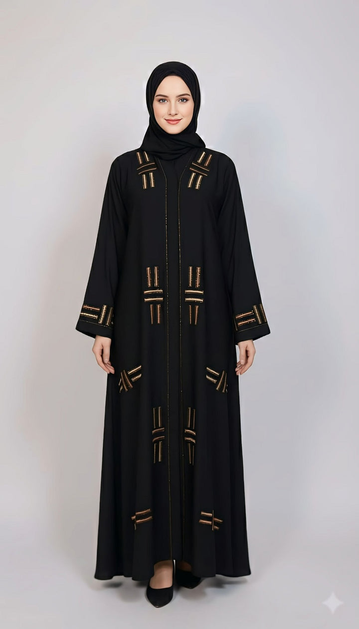 Step into effortless elegance with our Velour Marked Abaya — a premium piece crafted from soft Nada fabric, tailored for those who value minimalism with a touch of refined artistry. The front-open design is adorned with symmetrical thread embroidery in subtle bronze and beige tones, creating a graceful visual statement while maintaining a clean and modest look.